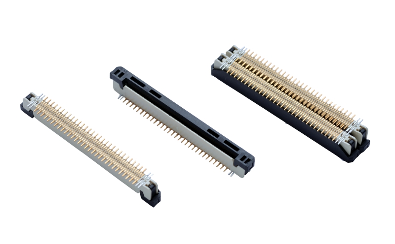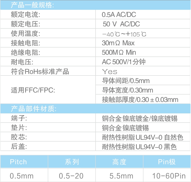 ◆ 該系列產(chǎn)品高度5.5mm,厚度3.2mm 間距為0.5mm的緊湊設(shè)計(jì),采用ZIF方式,帶鎖條立貼。端子引腳采用Z 字形排列,